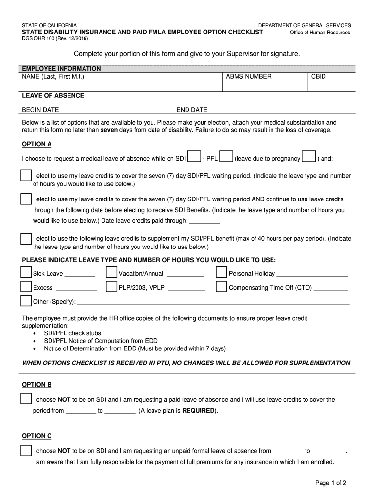 Get the free STATE DISABILITY INSURANCE AND PAID FMLA EMPLOYEE OPTION CHECKLIST