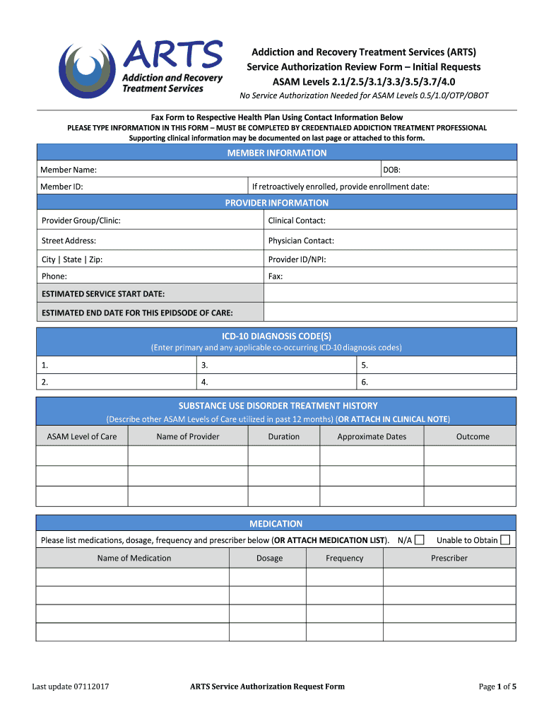 5 Clinically Managed High Intensity Residential Services Adults H0015 ASAM 2. 1 Intensive Outpatient Rev 0906 / H0015 ASAM 2. 1 Intensive Outpatient Medium Intensity Adolescent H2036 / rev 1002 ASAM 3. 7 Medically Monitored Intensive Inpatient Services Adults Monitored High Intensity Inpatient Services Adolescent Managed Inpatient Services S0201 ASAM 2. N/A Name of Medication Last update 07112017 Dosage Frequency ARTS Service Authorization Request Form Unable to Obtain Prescriber Page 1 of 5...