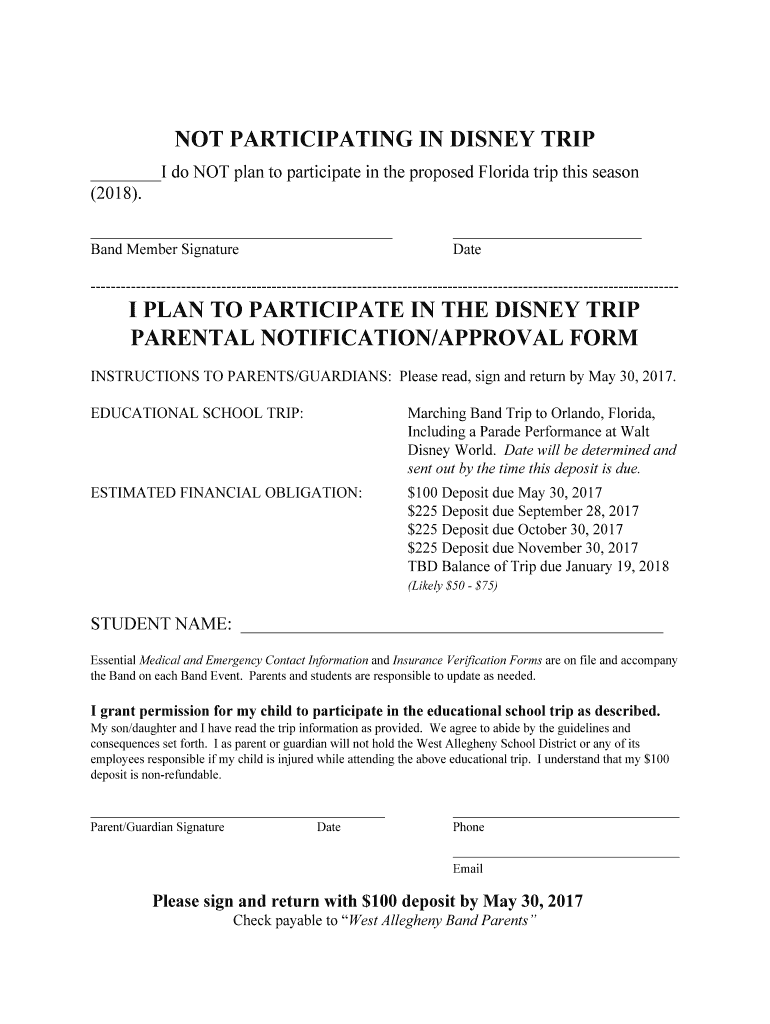 Parent/Guardian Signature Phone Email Please sign and return with 100 deposit by May 30 2017 Check payable to West Allegheny Band Parents. NOT PARTICIPATING IN DISNEY TRIP I do NOT plan to participate in the proposed Florida trip this season 2018. EDUCATIONAL SCHOOL TRIP Marching Band Trip to Orlando Florida Including a Parade Performance at Walt Disney World. Date will be determined and sent out by the time this deposit is due. ESTIMATED FINANCIAL OBLIGATION 100 Deposit due May 30 2017 225...