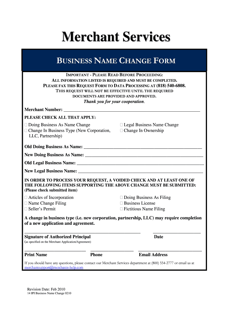 Signature of Authorized Principal Date as specified on the Merchant Application/Agreement Print Name Phone Email Address If you should have any questions please contact our Merchant Services department at 800 554-2777 or email us at merchantsupport merchants-help.com Revision Date Feb 2010 14 IPI Business Name Change 0210. Thank you for your cooperation. Merchant Number PLEASE CHECK ALL THAT APPLY Doing Business As Name Change Change In Business Type New Corporation LLC Partnership Legal...