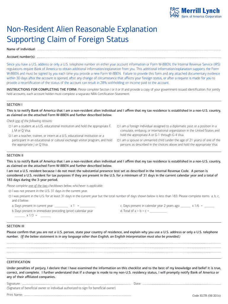 INSTRUCTIONS FOR COMPLETING THE FORM Please complete Section I or II or III and provide a copy of your government-issued identification. For jointly held accounts each account holder must complete a separate NRA Certification Statement. Signature. Date. Signature of beneficial owner or individual authorized to sign for beneficial owner Print Name. CERTIFICATION Under penalties of perjury I declare that I have examined the information on this checklist and to the best of my knowledge and...