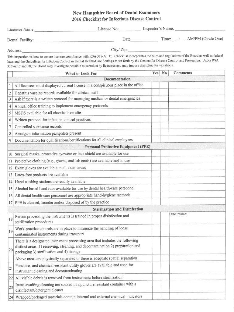 Inspector\'s Name:License Licensee Name:Time: :Interdental Facility:Address:AM/PM (Circle One)Circlip:This inspection