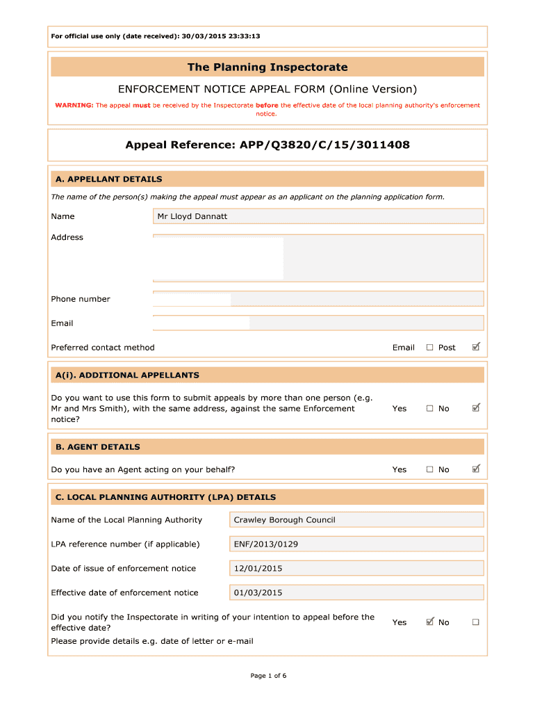 AGENT DETAILS Do you have an Agent acting on your behalf C. LOCAL PLANNING AUTHORITY LPA DETAILS Name of the Local Planning Authority Crawley Borough Council LPA reference number if applicable ENF/2013/0129 Date of issue of enforcement notice 12/01/2015 Effective date of enforcement notice 01/03/2015 Did you notify the Inspectorate in writing of your intention to appeal before the Please provide details e.g. date of letter or e-mail Page 1 of 6 I sent a letter to you on 19th Feb 2015....