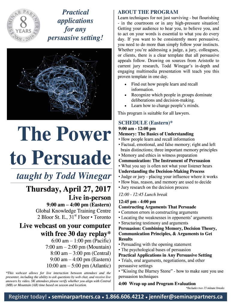 W. Suite 303A Toronto ON M4R 1A3 Tel. 1. 866. 606. 4212 or 647. 352. 8633 Fax 647. 352. 8533. Email jennifer seminarpartners. 00 64. 35 HST 13 559. 35 If paying by cheque adjust tax for attendee s province as follows 5 in AB BC MB NWT NU SK YK. REGISTRATION FEE with ON HST On or before March 10 2017 445. 50 57. 92 HST 13 503. 42 Save 50. 00 After March 10 2017 495. Ca 1. 866. 606. 4212 jennifer seminarpartners. ca MEET YOUR PRESENTER PRAISE FOR TODD WINEGAR Todd Winegar is a dynamic highly...