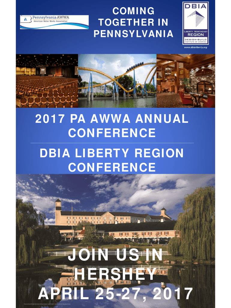 Sponsorship Levels Note All Sponsorships paid for by 12/31/16 will received a 10 Discount DBIA Networking April 26th-April 28th Breakfast Sponsor 500. COMING TOGETHER IN PENNSYLVANIA www. dbialiberty. org 2017 PA AWWA ANNUAL CONFERENCE DBIA LIBERTY REGION JOIN US IN HERSHEY APRIL 25-27 2017 Photos courtesy of Hershey Entertainment Resorts Company. And Hershey. Lodge is a trademark used with permission. Robert K. McIntyre DBIA C/O Stone Hill Contracting Co. Inc. PO Box 1370 Doylestown PA...
