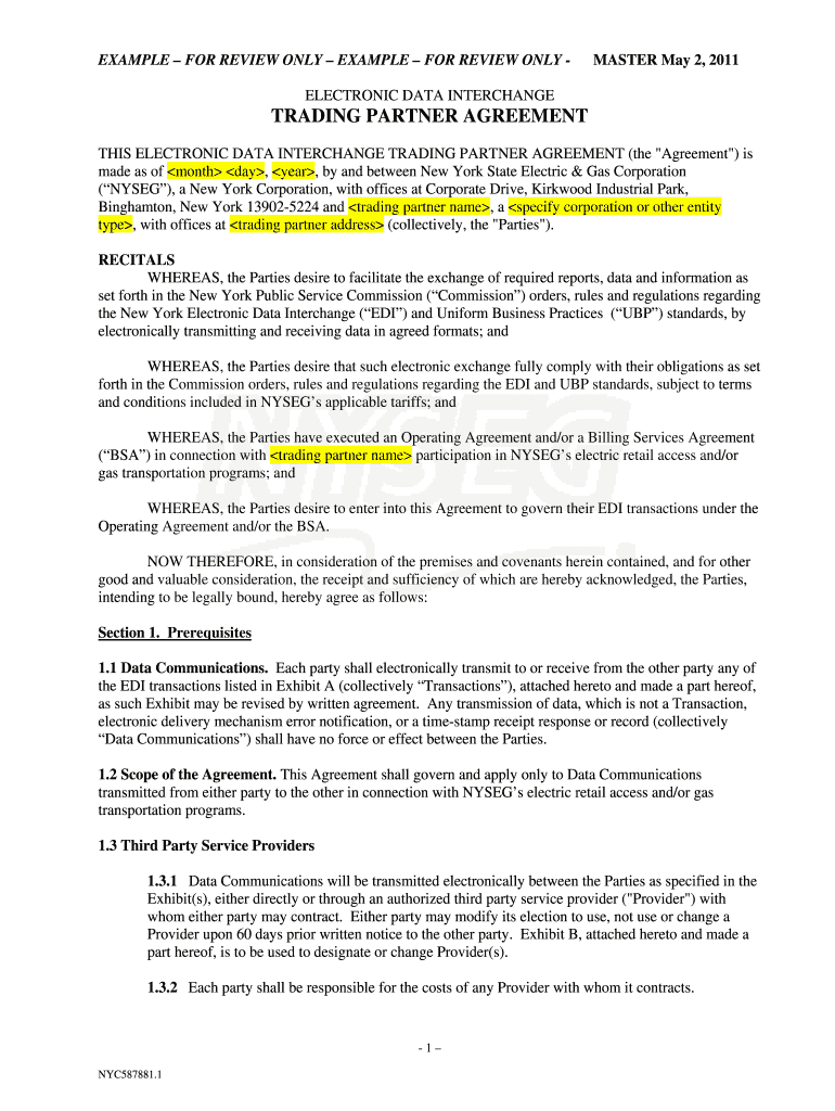 EXAMPLE FOR REVIEW ONLY EXAMPLE FOR REVIEW ONLY MASTER May 2, 2011ELECTRONIC DATA INTERCHANGETRADING PARTNER AGREEMENT THIS ELECTRONIC DATA INTERCHANGE TRADING PARTNER AGREEMENT (the “Agreement