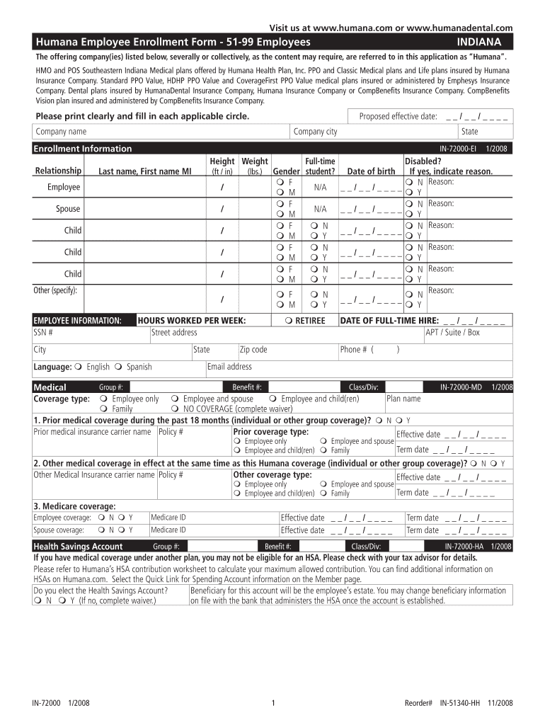 Standard PPO Value HDHP PPO Value and CoverageFirst PPO Value medical plans insured or administered by Emphesys Insurance Company. Dental plans insured by HumanaDental Insurance Company Humana Insurance Company or CompBenefits Insurance Company. Print Form Visit us at www. humana.com or www. humanadental.com Humana Employee Enrollment Form - 51-99 Employees INDIANA The offering company ies listed below severally or collectively as the content may require are referred to in this application as...