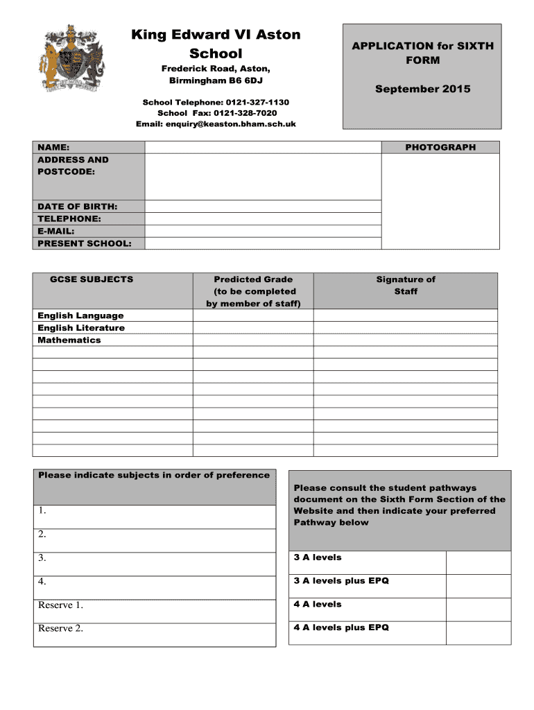 King Edward VI Aston School Frederick Road Aston Birmingham B6 6DJ APPLICATION for SIXTH FORM September 2015 School Telephone 0121-327-1130 School Fax 0121-328-7020 Email enquiry keaston.bham.sch. Mail Please tick as appropriate Excellent Good Satisfactory Under achieving Behaviour Attendance Punctuality Responsibility Creativity Oral communication Ability to work independently Relationship with staff Academic performance in relation to potential Involvement in extra curricular activities...