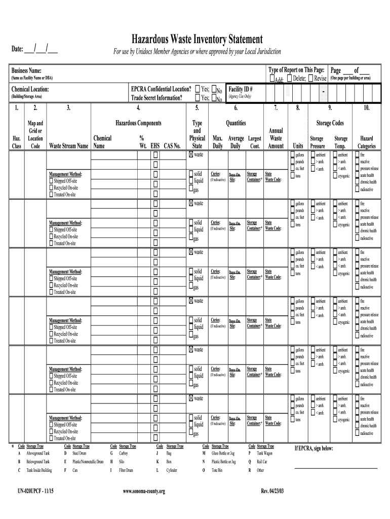 Hazardous Waste Inventory StatementDate: / / For use by Unidocs Member Agencies or where approved by your Local Jurisdiction Type of Report on This Page: Page of Delete; Revise (One page per building