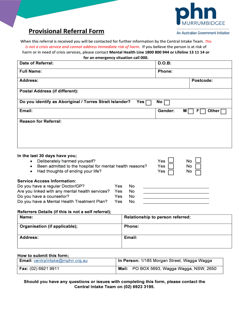 Au In Person 1/185 Morgan Street Wagga Wagga Mail PO BOX 5693 Wagga Wagga NSW 2650 Should you have any questions or issues with completing this form please contact the Central Intake Team on 02 6923 3195. Date of Referral D. O. B Full Name Phone Address Postcode Postal Address if different Do you identify as Aboriginal / Torres Strait Islander Yes No Email Gender M F Other Reason for Referral In the last 30 days have you Deliberately harmed yourself Been admitted to the hospital for mental...