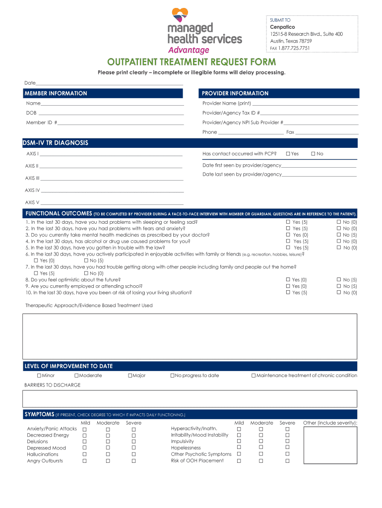 SUBMIT TO Cenpatico 12515-8 Research Blvd. Suite 400 Austin Texas 78759 FAX 1. 877. 725. 7751 OUTPATIENT TREATMENT REQUEST FORM Please print clearly incomplete or illegible forms will delay processing. Date MEMBER INFORMATION PROVIDER INFORMATION Provider Name print DOB Provider/Agency Tax ID Member ID Phone Fax DSM-IV TR DIAGNOSIS AXIS I Has contact occurred with PCP Date first seen by provider/agency Yes No Date last seen by provider/agency FUNCTIONAL OUTCOMES TO BE COMPLETED BY PROVIDER...