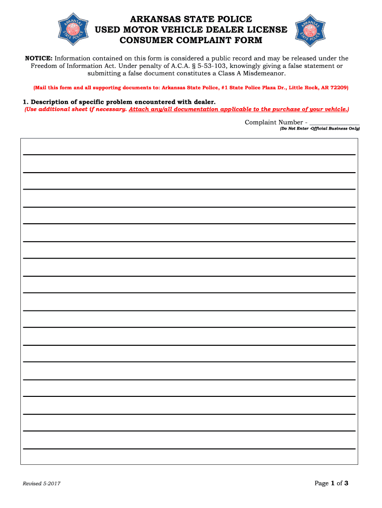 Under penalty of A. C. A. 5-53-103 knowingly giving a false statement or submitting a false document constitutes a Class A Misdemeanor. I understand that knowingly giving a false statement or submitting a false document will subject me to criminal prosecution. Signature of Complainant Date. C. A. 5-53-103 I the undersigned hereby affirm that all information contained on this form is true and correct. Internet Sale Name of website vehicle displayed on EBay Auto Trader Dealer Site Other 7....