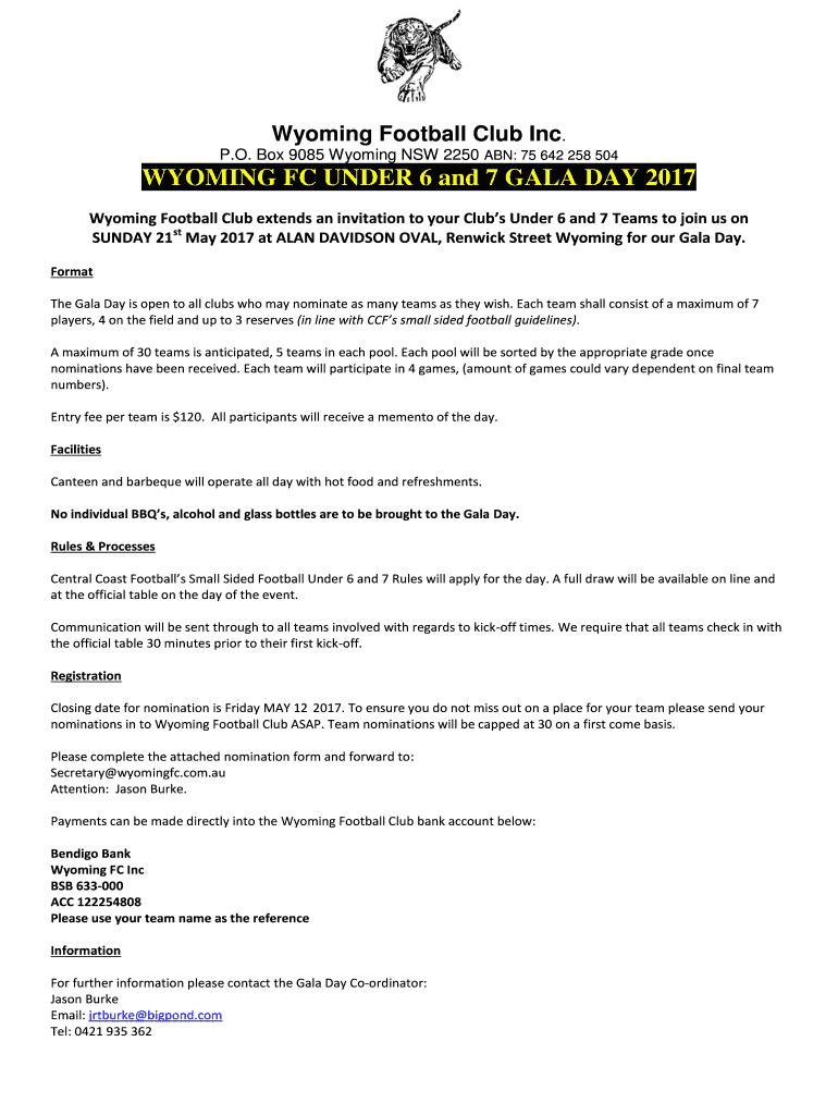 Wyoming Football Club Inc. P. O. Box 9085 Wyoming NSW 2250 ABN 75 642 258 504 WYOMING FC UNDER 6 and 7 GALA DAY 2017 SUNDAY 21st May 2017 at ALAN DAVIDSON OVAL Renwick Street Wyoming for our Gala Day. Team nominations will be capped at 30 on a first come basis. Please complete the attached nomination form and forward to Secretary wyomingfc.com.au Attention Jason Burke. Payments can be made directly into the Wyoming Football Club bank account below Bendigo Bank Wyoming FC Inc BSB 633-000 ACC...