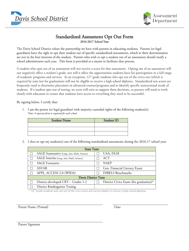 Arts Math Science UAA DLM SAGE Interim Lang. Arts Math Science ACT SAGE Formative NAEP ASVAB Gen. Financial Literacy Exam APPL ACCESS 2. I elect to opt my student s out of the following standardized assessments during the 2016-17 school year State Tests SAGE Summative Lang. Standardized Assessment Opt Out Form 2016-2017 School Year The Davis School District values the partnership we have with parents in educating students. 0 WIDA DIBELS Benchmarks Davis District Tests District-developed...