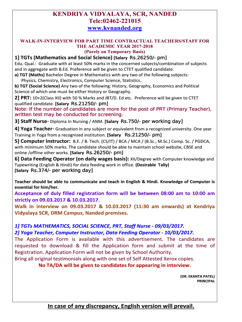 03. 2017 10. 03. 2017. Walk in interview on 09. 03. 2017 10. 03. 2017 11 30 am onwards at Kendriya Vidyalaya SCR DRM Campus Nanded premises. KENDRIYA VIDYALAYA SCR NANDED Tele 02462-221015 www. kvnanded.org WALK-IN-INTERVIEW FOR PART TIME CONTRACTUAL TEACHERS/STAFF FOR THE ACADEMIC YEAR 2017-2018 Purely on Temporary Basis 1 TGTs Mathematics and Social Science Salary Rs. E. / B. Tech. CS/IT / BCA / MCA / B. Sc. M. Sc. Comp. Sc. / PGDCA with minimum 50 marks. The candidate should be able to...