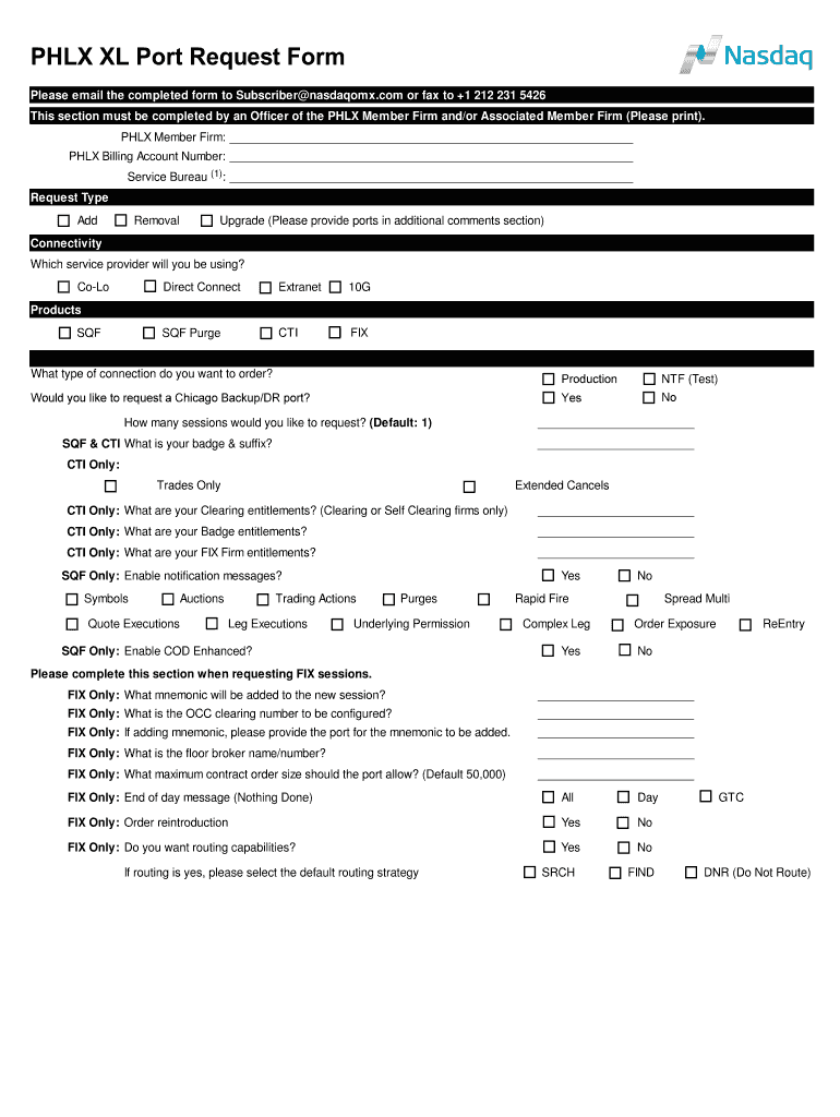 Nasdaqtrader. com/content /AdministrationSupport/AgreementsTrading/nwiiagreement. pdf. All services and products requested on this form are governed by the terms in the NASDAQ OMX U.S. Services agreement NASDAQ OMX U.S. Services agreement and the NASDAQ OMX Transaction Services Policies document. PHLX Member Firm PHLX Billing Account Number Service Bureau 1 Request Type Add Removal Upgrade Please provide ports in additional comments section Connectivity Which service provider will you be...