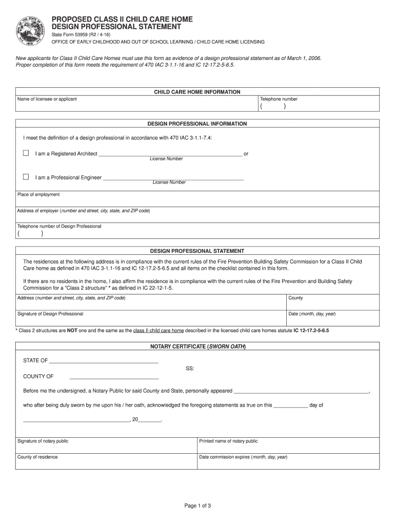 Errata filed Aug 7 1996 11 10 a.m. 19/R 3471 readopted filed Ju112 2001 1 40 p.m. 24/R 4235 Qualification for licensure of class II child care home Sec. 6. 2-5-6. 5 shall prevail. Division of Family Resources 470 lAC 3-1. 3-1 filed Sep 27 1996 12 35 o. m. 20 IR 322 readopted flied Ju112 2001 1 40 p.m. 241R 4235 470 lAC 3-1. 3. Class II Child Care Homes 470 lAC 3-1. 3-1 Class II child care home services Authority IC 12-13-5-3 Affected IC 12-17. Proper completion of this form meets the...