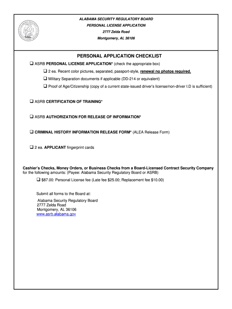 Fees for the Alabama Security Officer License Application may vary depending on the type of license being applied for. You should consult the Alabama Security Regulatory Board's website or contact their office for the most current fee schedule.