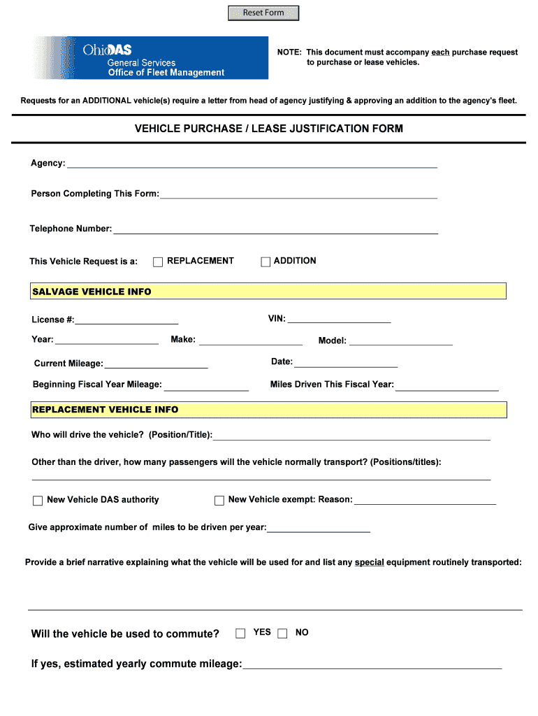 VEHICLE PURCHASE / LEASE JUSTIFICATION FORM Agency Person Completing This Form Telephone Number This Vehicle Request is a ADDITION REPLACEMENT SALVAGE VEHICLE INFO VIN License Year Make Model Current Mileage Date Beginning Fiscal Year Mileage Miles Driven This Fiscal Year Who will drive the vehicle Position/Title Other than the driver how many passengers will the vehicle normally transport Positions/titles New Vehicle DAS authority New Vehicle exempt Reason Give approximate number of miles to...