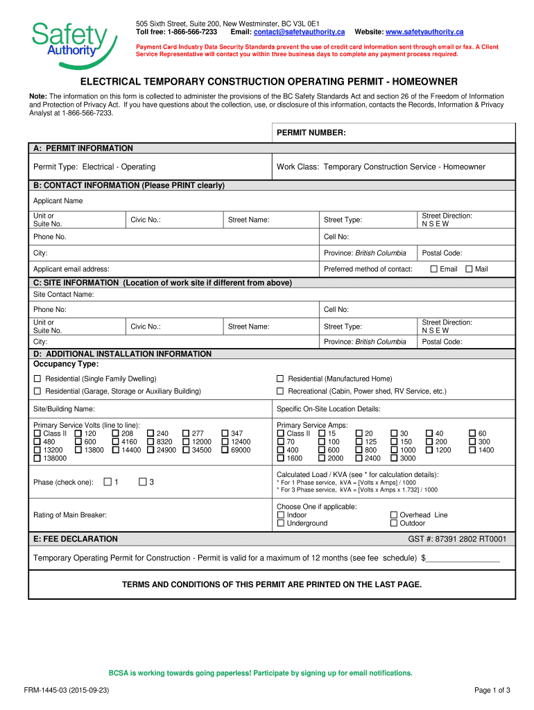 505 Sixth Street Suite 200 New Westminster BC V3L 0E1 Toll free 1-866-566-7233 Email contact safetyauthority. Checking this box and submitting this form to BC Safety Authority via email constitutes your authorization. This has the same effect as submitting a handwritten signature. The permit is valid for one year. Requesting Inspections Homeowner Inspection Request form supplied by the BC Safety Authority or by submitting a request online at www. Safetyauthority. ca. All Final Inspection...