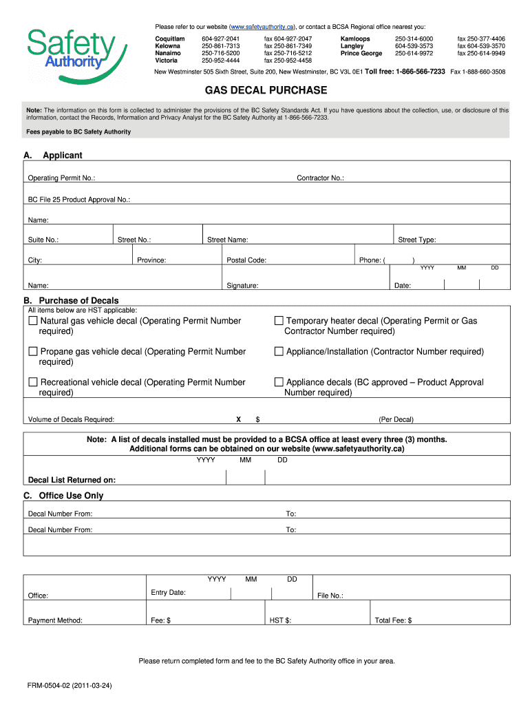 Purchase of Decals All items below are HST applicable Natural gas vehicle decal Operating Permit Number required Temporary heater decal Operating Permit or Gas Contractor Number required Propane gas vehicle decal Operating Permit Number Appliance/Installation Contractor Number required Recreational vehicle decal Operating Permit Number Appliance decals BC approved Product Approval Number required Volume of Decals Required X Per Decal Note A list of decals installed must be provided to a BCSA...