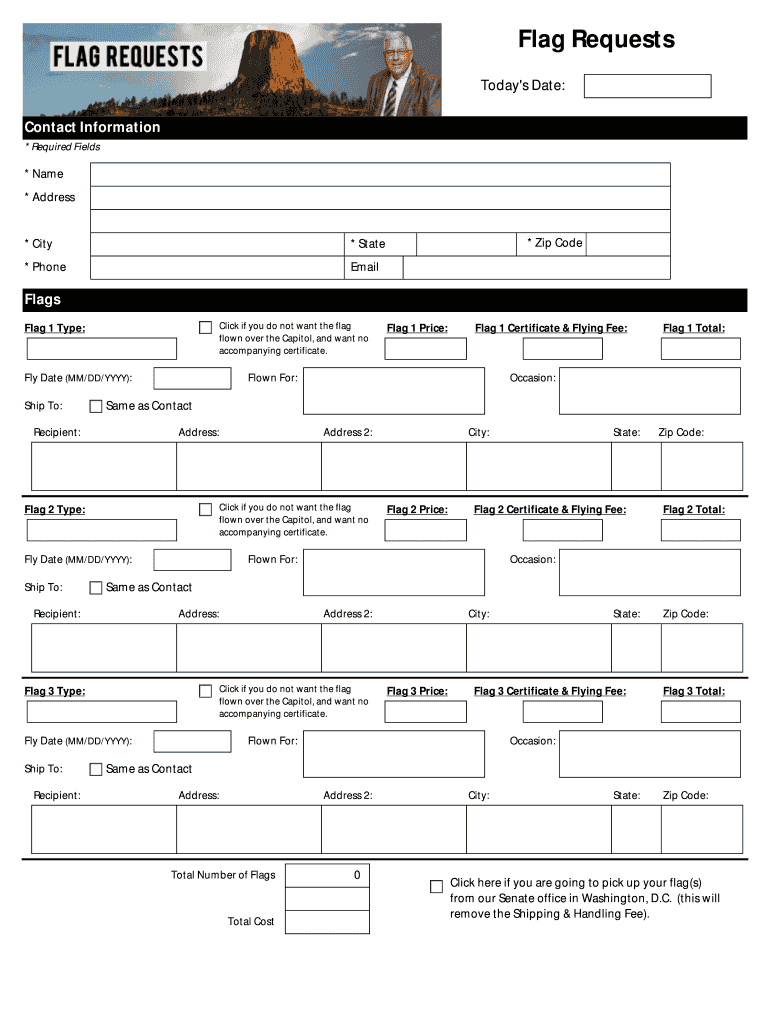 Flag 1 Type Fly Date MM/DD/YYYY Ship To Flown For Flag 2 Price Flag 2 Certificate Flying Fee Flag 2 Total Occasion Same as Contact Recipient Total Number of Flags Total Cost Click here if you are going to pick up your flag s from our Senate office in Washington D.C. this will remove the Shipping Handling Fee. Flag Requests Today s Date Contact Information Required Fields Name Address City State Phone Email Zip Code Flags Click if you do not want the flag flown over the Capitol and want no...