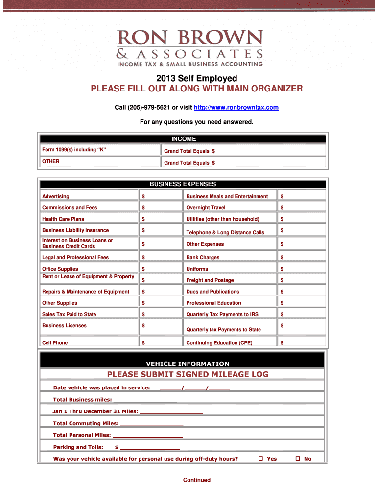 2013 Self Employed PLEASE FILL OUT ALONG WITH MAIN ORGANIZER Call (205)9795621 or visit http://www.ronbrowntax.com For any questions you need answered. INCOME Form 1099(s) including K Grand Total