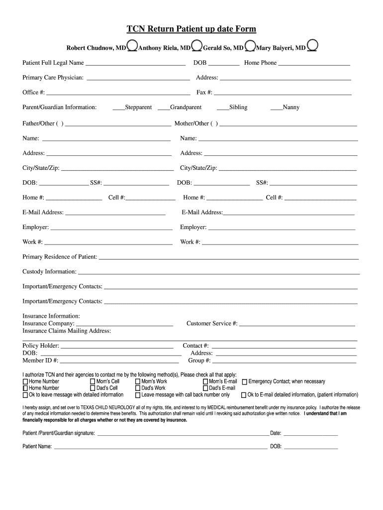 TCN Return Patient update Form Robert Hudson, MD Anthony Rail, MD Gerald So, MD Mary Bayer, MD Patient Full Legal Name DOB Home Phone Primary Care Physician: Address: Office #: Fax #: Parent/Guardian