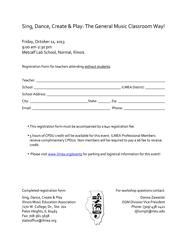 5 hours of CPDU credit will be available for this event. ILMEA Professional Members receive complimentary CPDUs. Ste. 201 Palos Heights IL 60463 Fax 708- 361- 5638 stateoffice ilmea.org Donna Zawatski EGM Division Vice President Phone 309 438- 2411 djhumph ilstu. Sing Dance Create Play The General Music Classroom Way Friday October 11 2013 9 00 am- 2 30 pm Metcalf Lab School Normal Illinois Registration Form for teachers attending without students....