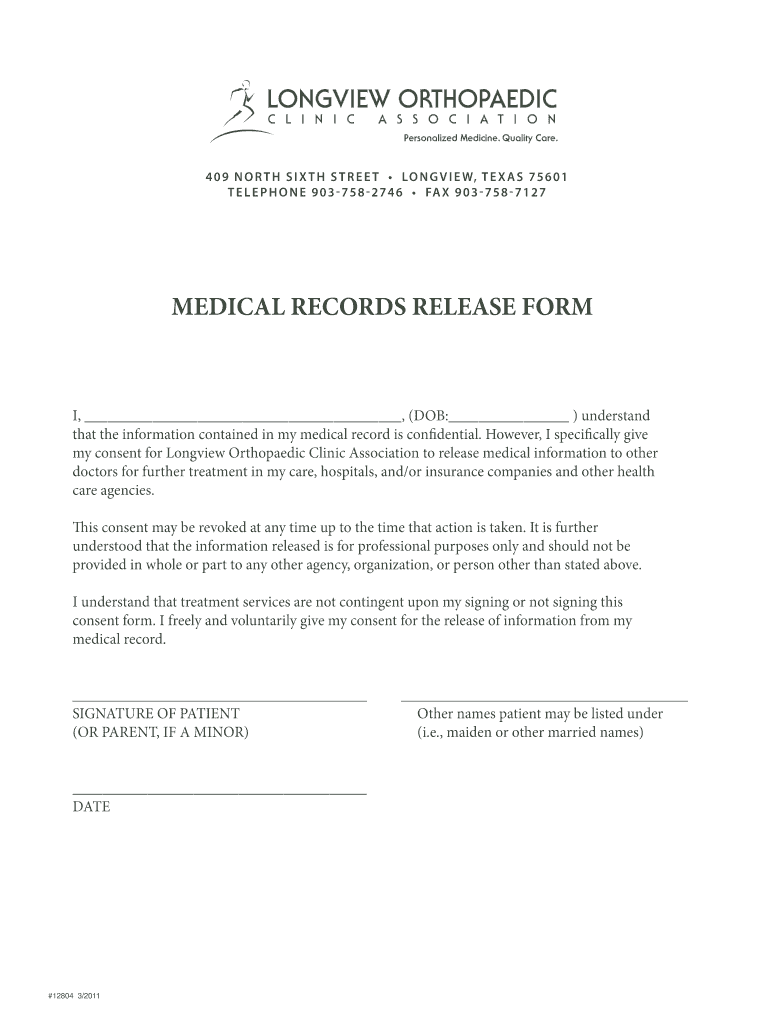 The Medical Records Release Form is a healthcare consent document used by patients and parents to authorize the release of a patient's medical information to specified entities.