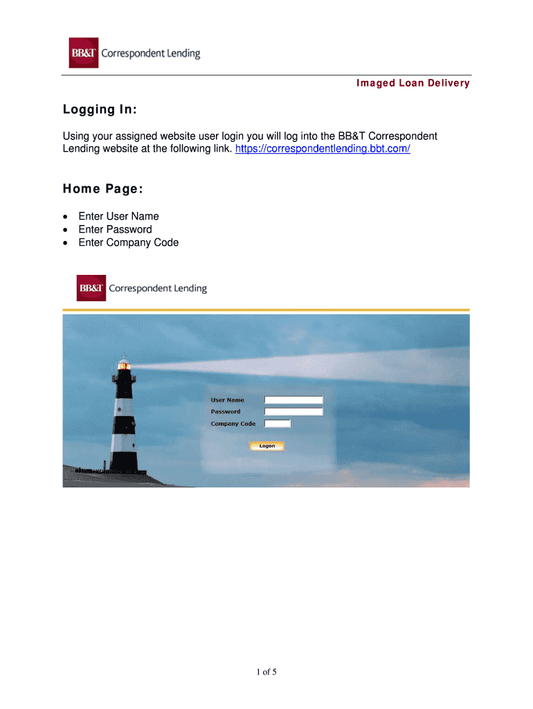 Imaged Loan DeliveryLogging In: Using your assigned website user login you will log into the BBT Correspondent Lending website at the following link. https://correspondentlending.bbt.com/Home Page: