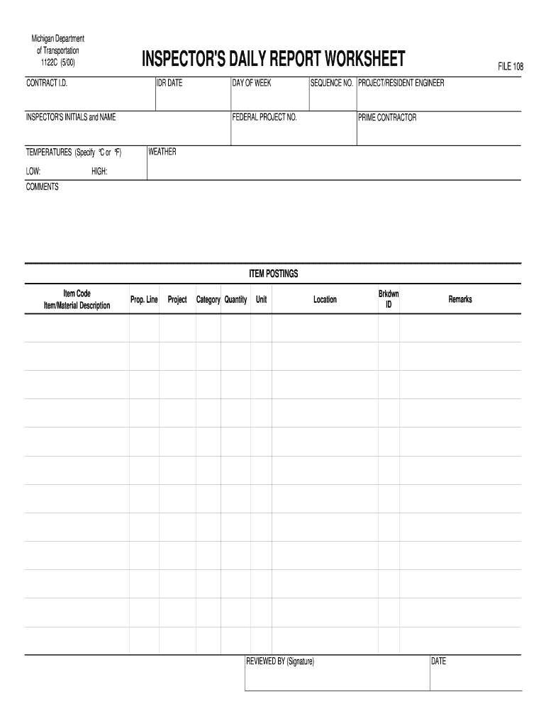 This form, known formally as the Michigan DOT Form 1122C, acts as a comprehensive tool for inspectors, providing a structured way to keep track of various aspects of daily inspections. It helps maintain a clear record of progress and conditions on site, thereby ensuring compliance and operational integrity.