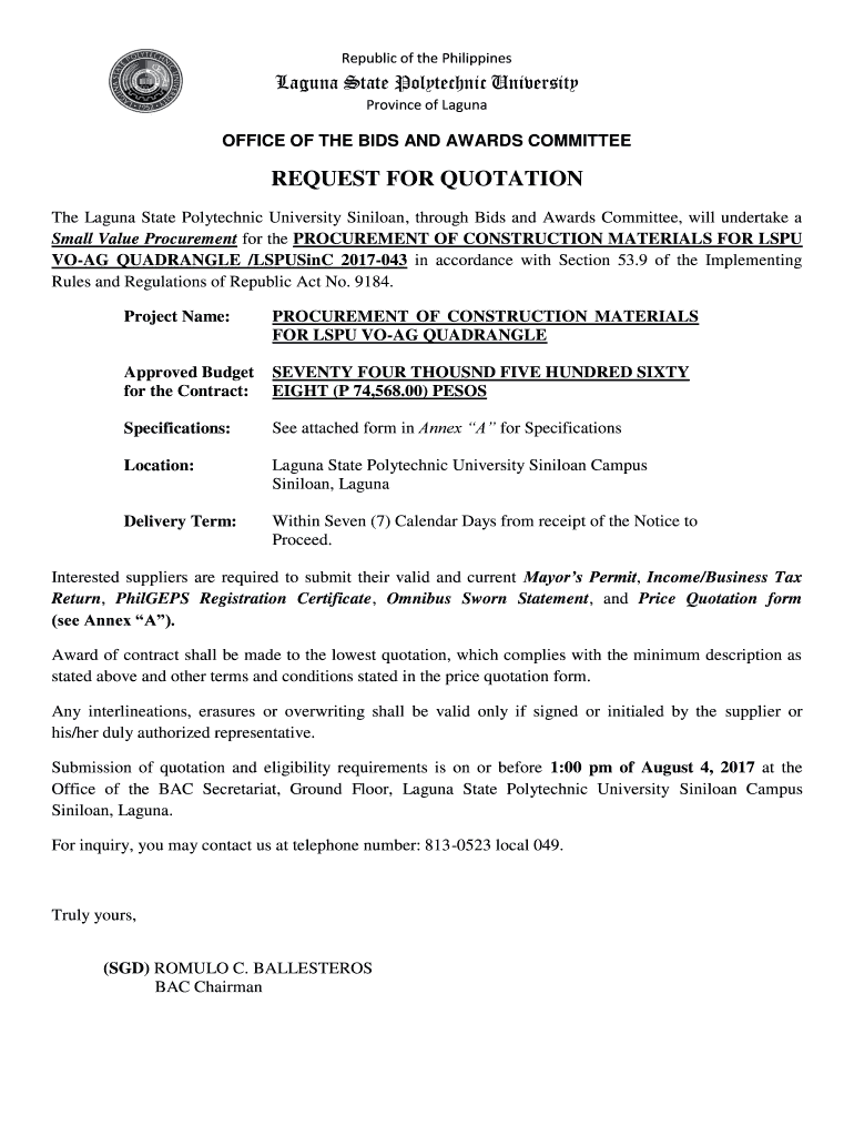 M Pcs Kgs Gal UNIT PRICE AMOUNT TERMS AND CONDITIONS 1. Canvass to be submitted sealed. 2. Any open canvass submitted to our office will not be honored. 3. Republic of the Philippines Laguna State Polytechnic University Province of Laguna OFFICE OF THE BIDS AND AWARDS COMMITTEE REQUEST FOR QUOTATION The Laguna State Polytechnic University Siniloan through Bids and Awards Committee will undertake a Small Value Procurement for the PROCUREMENT OF CONSTRUCTION MATERIALS FOR LSPU VO-AG QUADRANGLE...