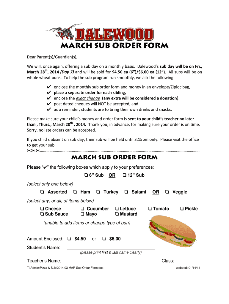 MARCH SUB ORDER FORM Dear Parent(s)/Guardian(s), We will, once again, offering a sub day on a monthly basis. Dale wood s sub day will be on Fri., March 28th, 2014 (Day 7) and will be sold for $4.50