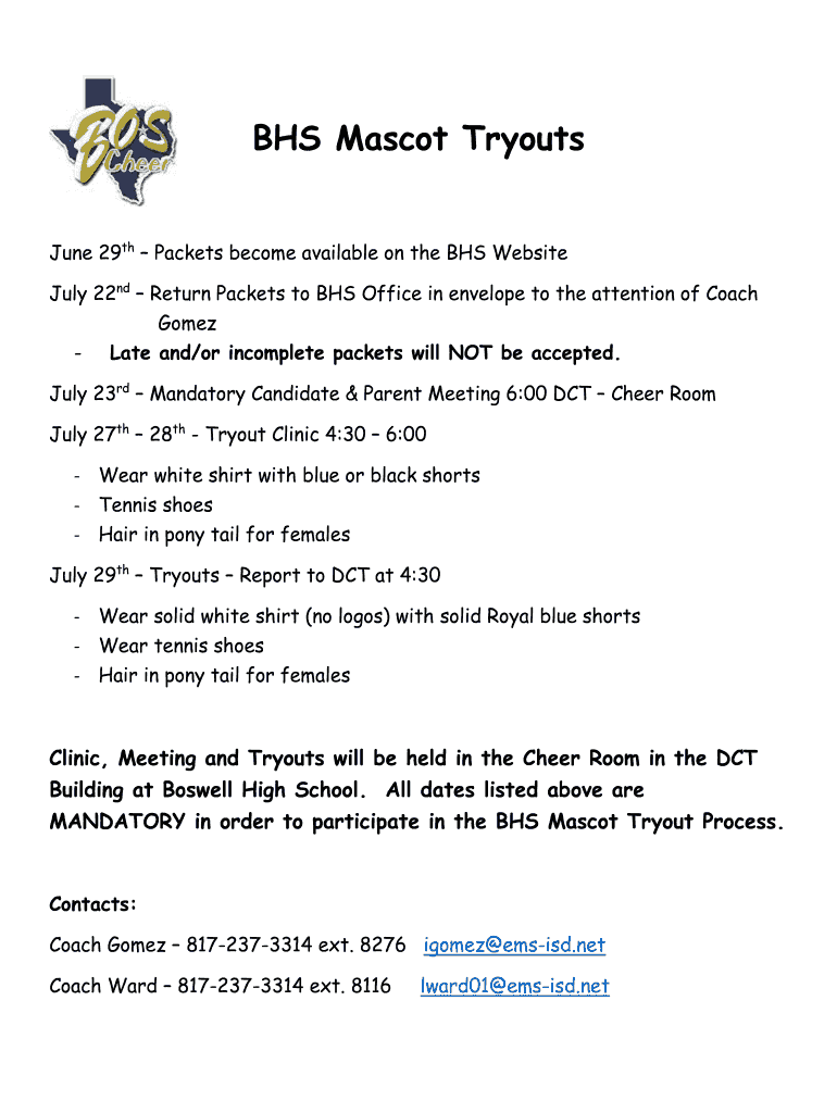 BHS Mascot Tryouts June 29th Packets become available on the BHS Website July 22nd Return Packets to BHS Office in envelope to the attention of Coach Gomez Late and/or incomplete packets will NOT