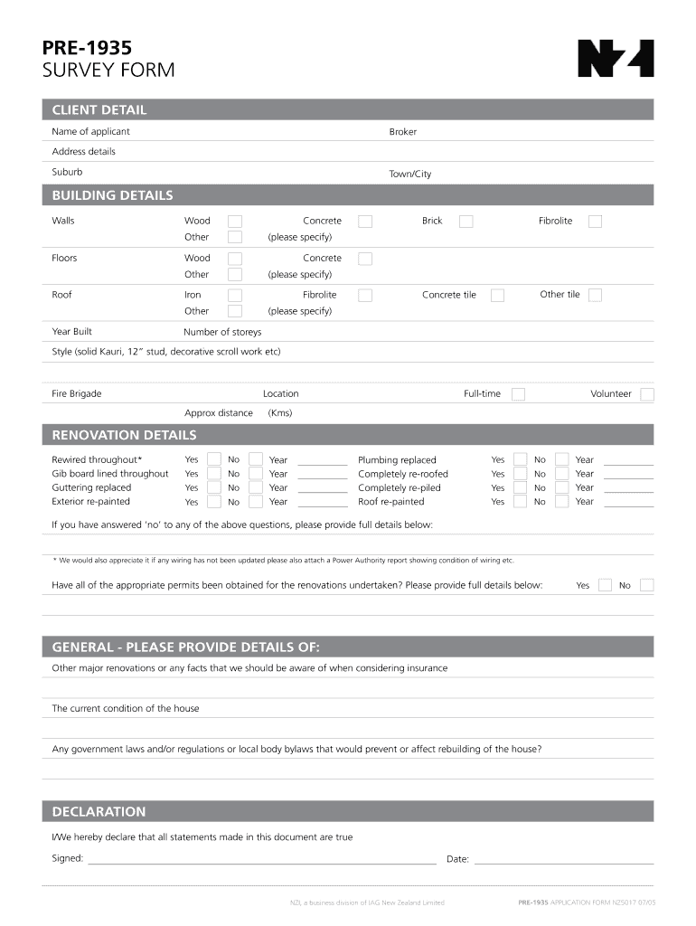 The Pre-1935 Building Survey Form is a property disclosure document used by building owners in New Zealand to assess the condition and history of pre-1935 structures for insurance purposes.