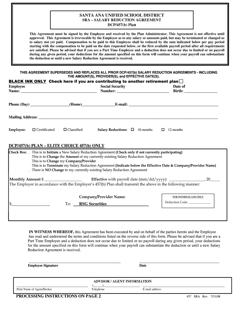 SANTA ANA UNIFIED SCHOOL DISTRICT SRA SALARY REDUCTION AGREEMENT DCP/457(b) Plan This Agreement must be signed by the Employee and received by the Plan Administrator. This Agreement is not effective