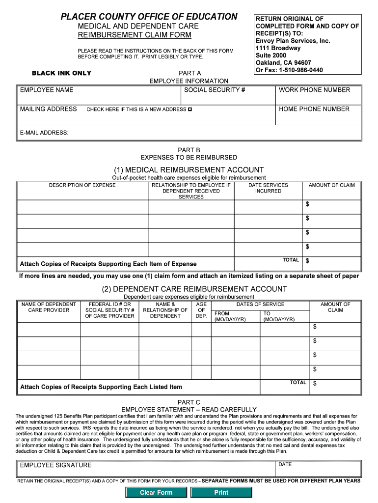 PLACER COUNTY OFFICE OF EDUCATION RETURN ORIGINAL OF COMPLETED FORM AND COPY OF RECEIPT(S) TO: Envoy Plan Services, Inc. 1111 Broadway Suite 2000 Oakland, CA 94607 Or Fax: 1-510-986-0440 MEDICAL AND