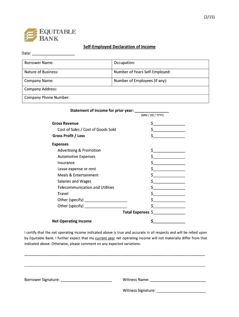 Otherwise please comment on any expected variations Borrower Signature Witness Name Witness Signature. 2/15 Self-Employed Declaration of Income Date Borrower Name Occupation Nature of Business Number of Years Self-Employed Company Name Number of Employees if any Company Address Company Phone Number Statement of Income for prior year MM / DD / YYYY Gross Revenue Cost of Sales / Cost of Goods Sold Gross Profit / Loss Expenses Advertising Promotion Automotive Expenses Insurance Lease expense or...
