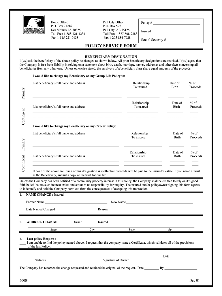 Fields for entering the beneficiary's full name, address, relationship to the insured, date of birth, and percentage of proceeds.