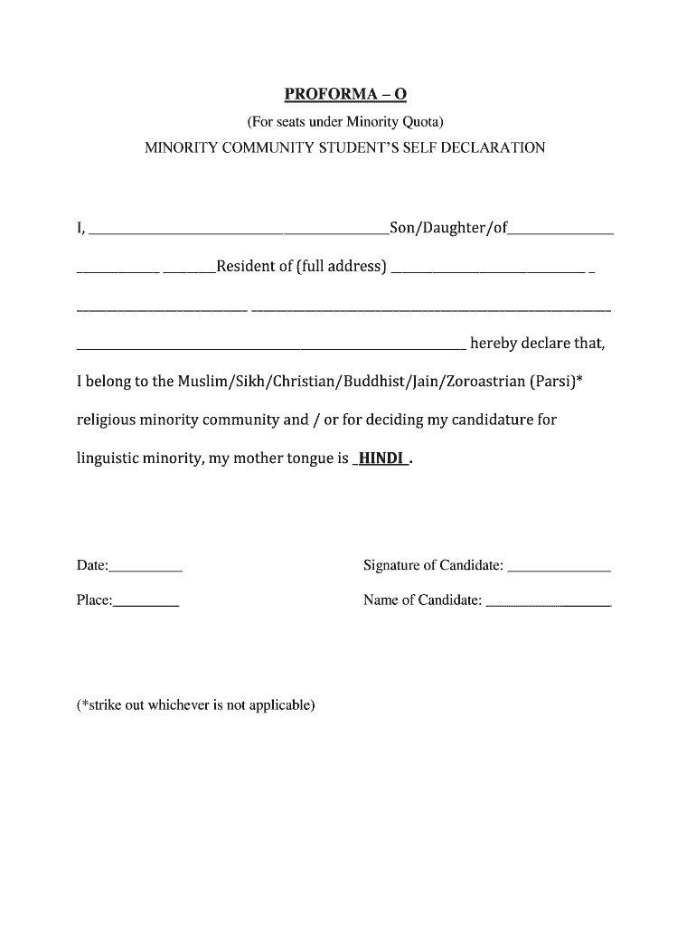 PROFORMA O For seats under Minority Quota MINORITY COMMUNITY STUDENT S SELF DECLARATION I Son/Daughter/of I belong to the Muslim/Sikh/Christian/Buddhist/Jain/Zoroastrian Parsi religious minority community and / or for deciding my candidature for linguistic minority my mother tongue is HINDI.