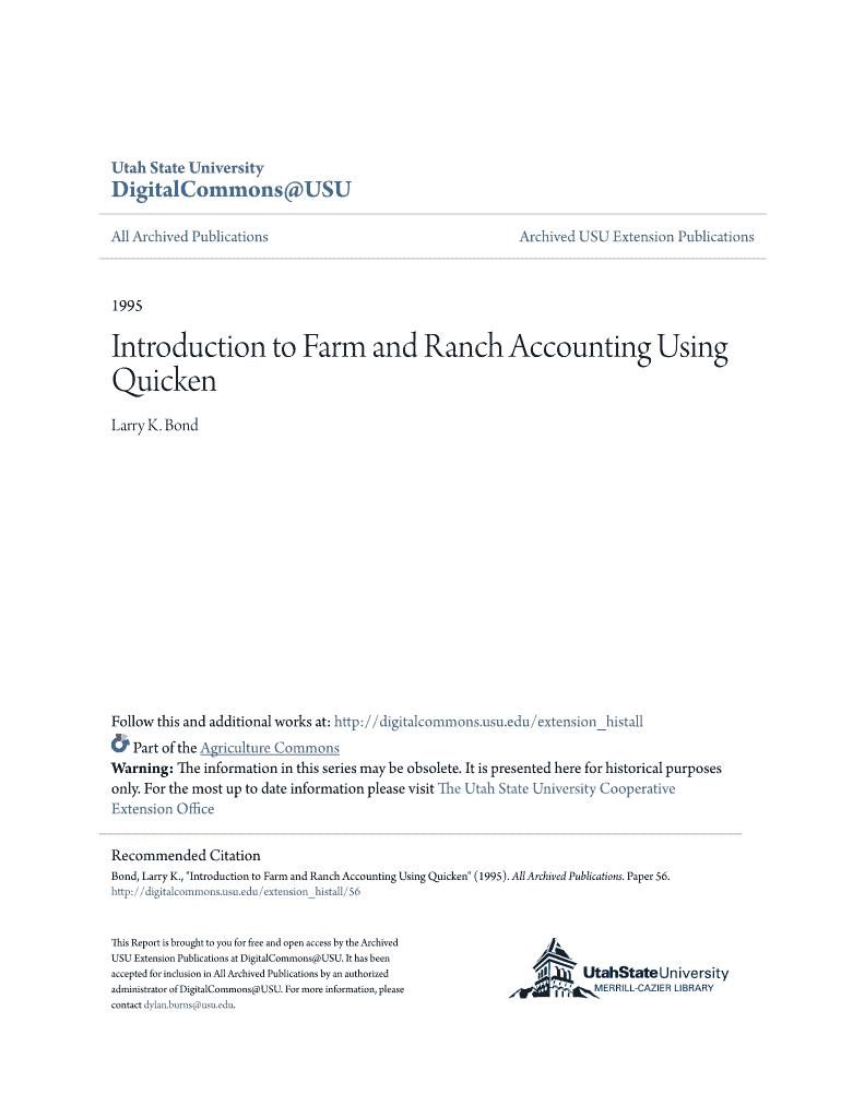 Usu.edu/extensionhistall/56 This Report is brought to you for free and open access by the Archived USU Extension Publications at DigitalCommons USU. Utah State University DigitalCommons USU All Archived Publications Archived USU Extension Publications Introduction to Farm and Ranch Accounting Using Quicken Larry K. Quicken s Cash Flow Report is a summary of the cash inflows and cash outflows for a specific period of time. Inflows of 600 were from cash sales. Outflows were 500 to the repair...