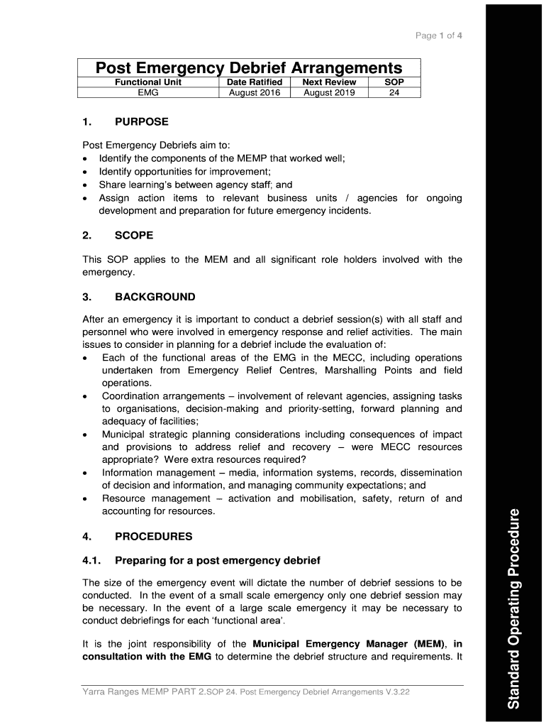 Actions resulting from a debrief may include Amending or revising Plans or Standard Operating Procedures SOPs Changing the MECC structure Revising training requirements Changing equipment or purchasing new equipment Changing organisational policy and/or Analysing and reporting back to the MEMPC on specific problems. It Yarra Ranges MEMP PART 2. SOP 24. Post Emergency Debrief Arrangements V. 3. 22 Standard Operating Procedure is the responsibility of the MEM or delegate to allocate...