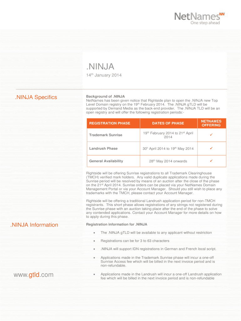 The. NINJA TLD will be an open registry and will offer the following registration periods DATES OF PHASE NETNAMES OFFERING Trademark Sunrise 19th February 2014 to 21st April Landrush Phase 30h April 2014 to 19th May 2014 28th May 2014 onwards REGISTRATION PHASE General Availability Rightside will be offering Sunrise registrations to all Trademark Clearinghouse TMCH verified mark holders. NINJA 14th January 2014. NINJA Specifics Background of. NINJA NetNames has been given notice that...