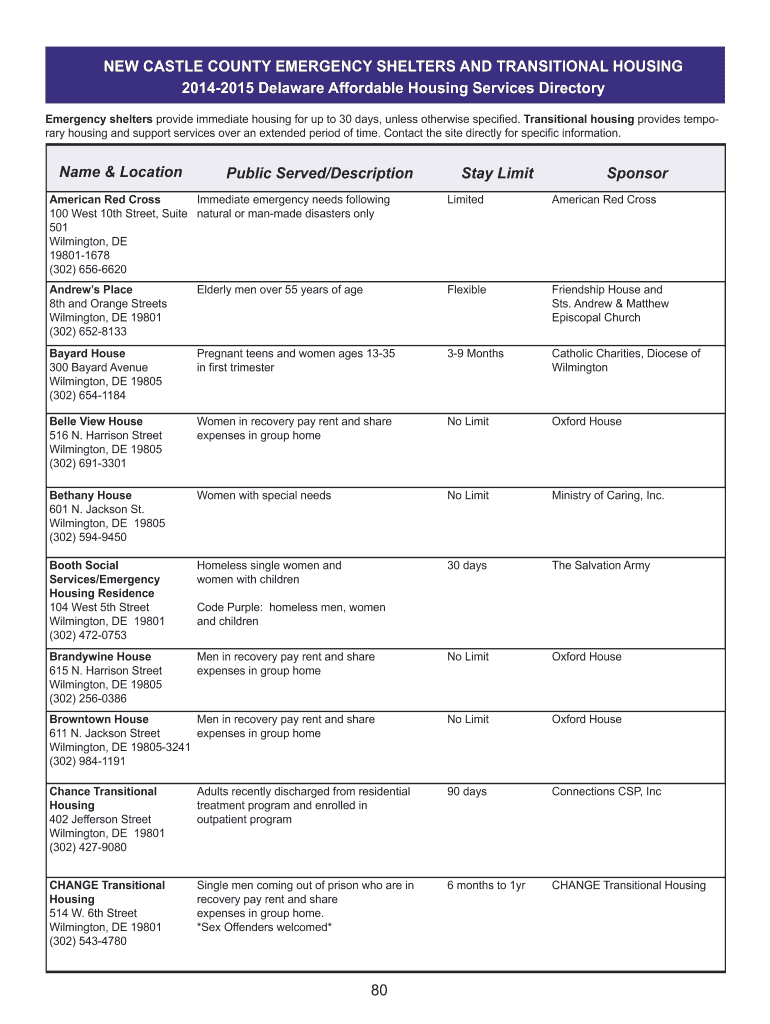 NEW CASTLE COUNTY EMERGENCY SHELTERS AND TRANSITIONAL HOUSING 20142015 Delaware Affordable Housing Services Directory Emergency shelters provide immediate housing for up to 30 days, unless otherwise