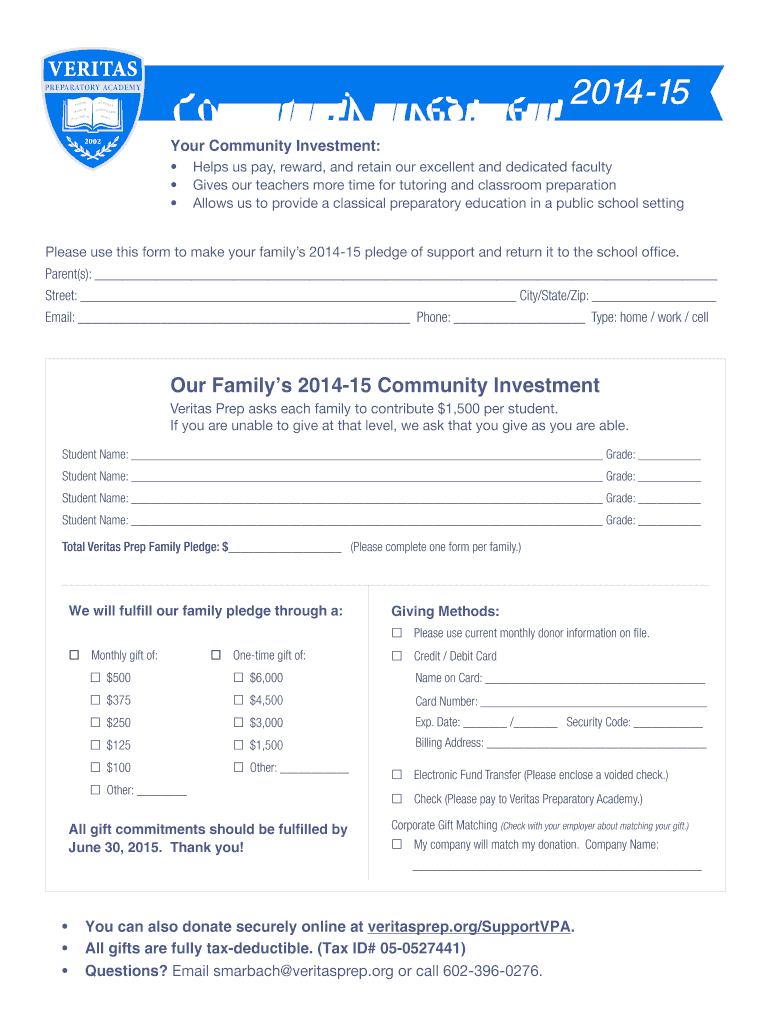The Arizona Student Reenrollment Packet is an education document used by parents or guardians to reenroll their students for the 2014-15 school year at Veritas Preparatory Academy.