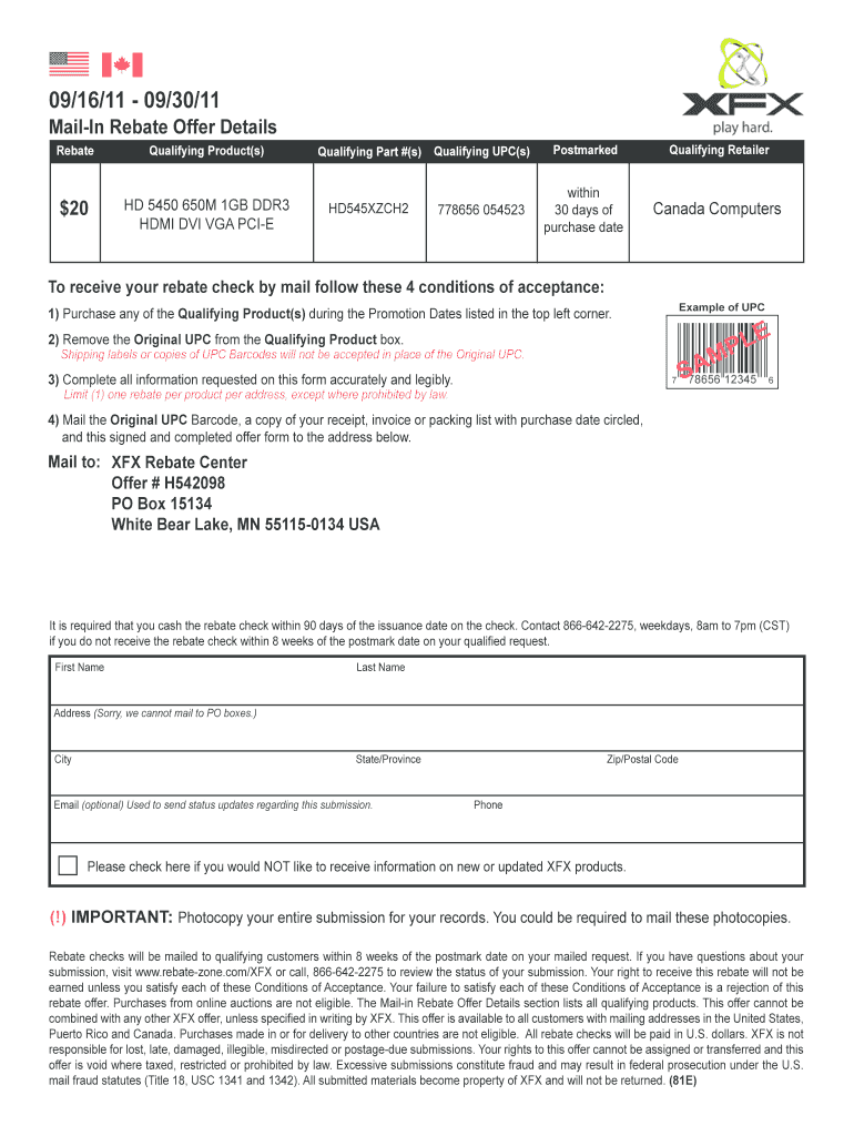 09/16/11 09/30/11 Mail-In Rebate Offer Details Rebate Qualifying Product(s) $20 HD 5450 650M 1 GB DDR3 HDMI DVI VGA PCI-E Qualifying Part #(s) Qualifying UPC(s) HD545XZCH2 778656 054523 Postmarked