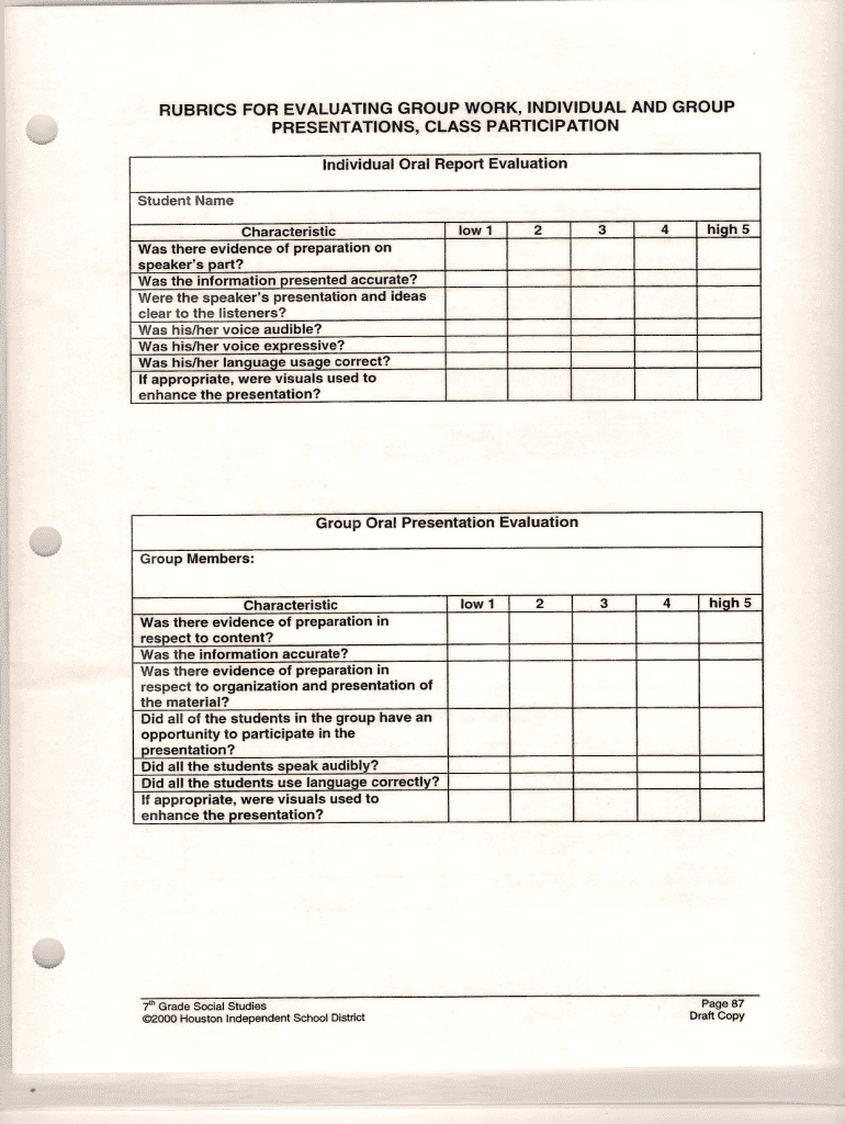 RUBRICS FOR EVALUATING GROUP WORK INDIVIDUAL PRESENTATIONS CLASS PARTICIPATION Name low 1 Oral Report Evaluation hi h Individual voice clear to listeners expressive enhance the presentation Was his/her lan ua e usa eused correct information presented accurate speaker s part If appropriate wereaudible visuals to ideas Were thethe and Characteristic GrouplowOral material Did all students use speak audibly of in group have an respect there tothe content evidence organization of preparation...