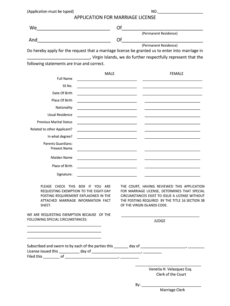 Understanding the fees and processing time for the Virgin Islands Marriage License Application is crucial for applicants. The application incurs a fee that varies by court, and the processing period can differ based on urgency. Budgeting accordingly and knowing what to expect in terms of time can facilitate a smoother experience.