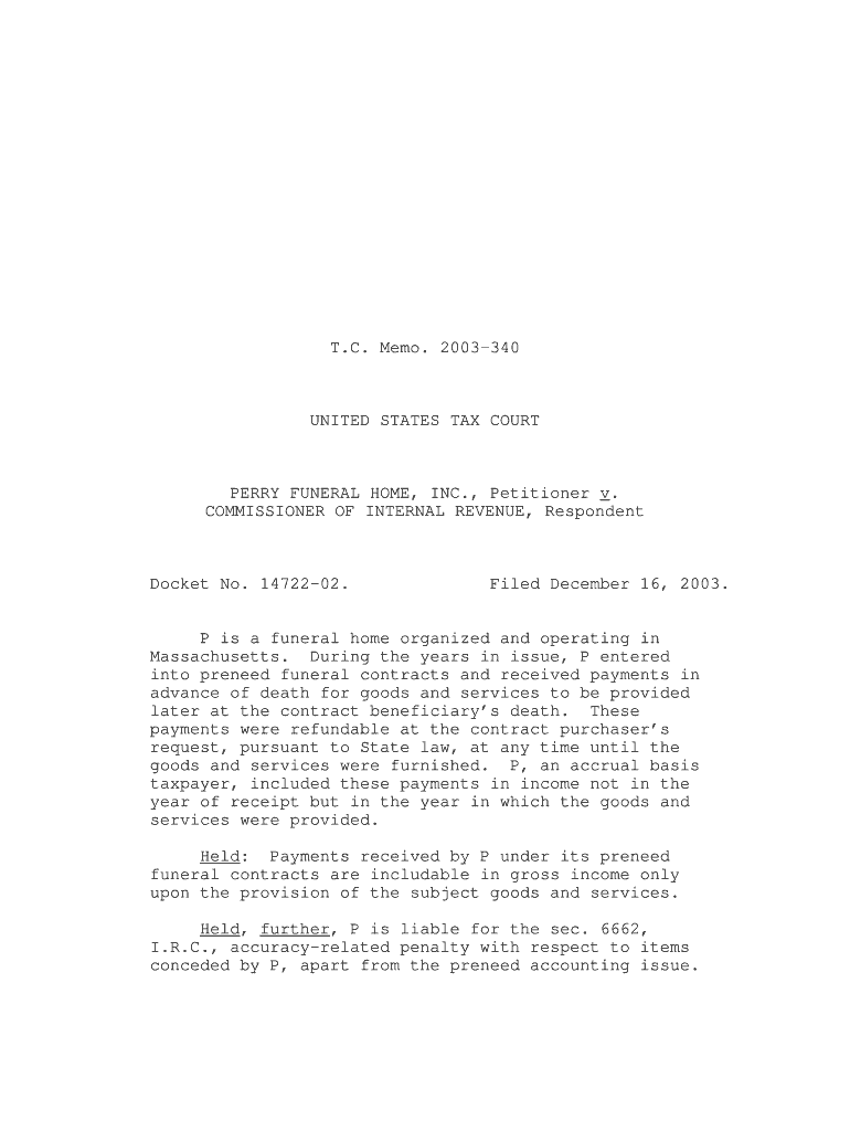 COMMISSIONER OF INTERNAL REVENUE, RespondentDocket No. 1472202. Filed December 16, 2003. P is a funeral home organized